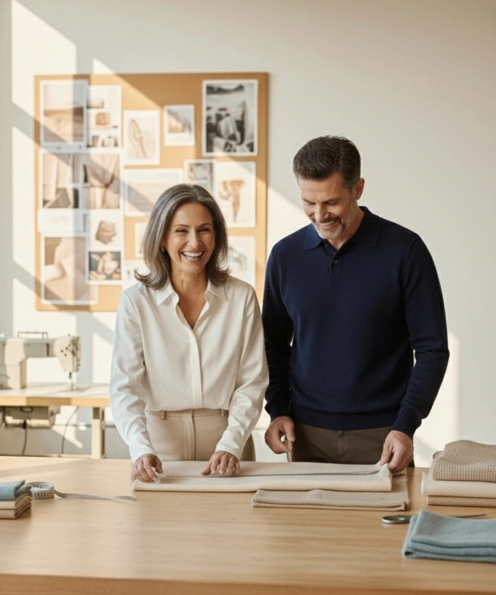 At Evelyn & Mark, everything began with a simple promise made fifteen years ago. In those early days, Evelyn sketched her first designs at a small kitchen table while Mark searched for fabrics that could speak to real women. They believed clothing should feel personal, warm, and honest—created with care for the moments that matter. After years of learning the craft, they built something of their own that reflected their values and the women they wanted to serve.